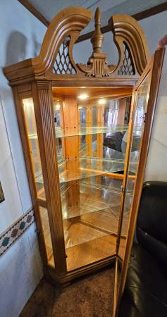 Wooden corner curio shelf. Measures 29x29x78. Lights up just doesn't have the bulb. 4 glass shelfs . Excellent condition. Must pick up. $150. Must pick up on East Gutierrez